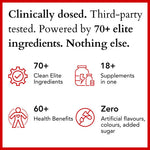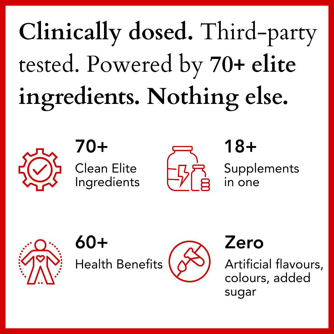Clinically dosed. Third-party tested. Powered by 70+ elite ingredients. Nothing else.